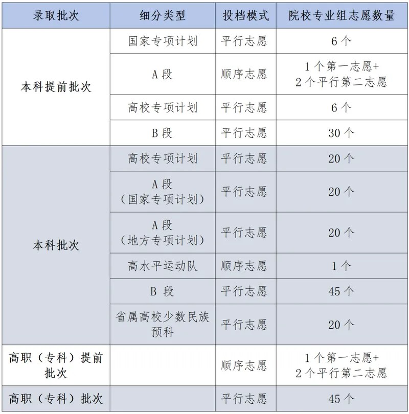 本科批次高校专项计划设置20个平行的院校专业组志愿。